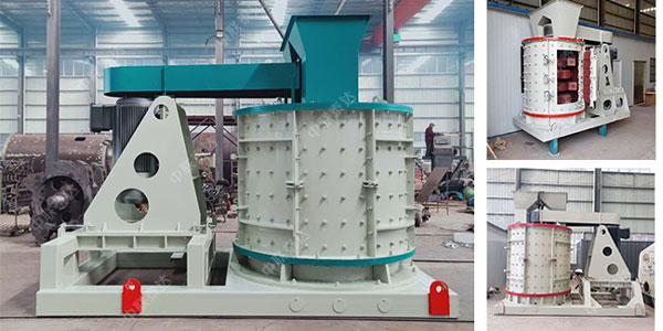 物料由機器上部垂直落入高速旋轉的葉輪內,在高速離心力的作用下,與另一部分以傘狀形式分流在葉輪四周的物料產生高速撞擊與粉碎,物料在互相撞擊后,又會在葉輪和機殼之間以物料形成渦流多次的互相撞擊、摩擦而粉碎,從下部直通排出,形成閉路多次循環,由篩分設備控制達到所要求的成品粒度。