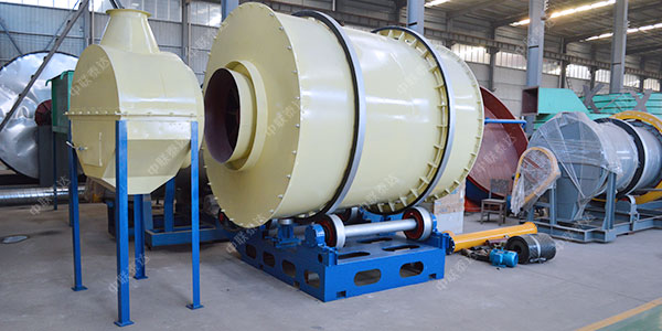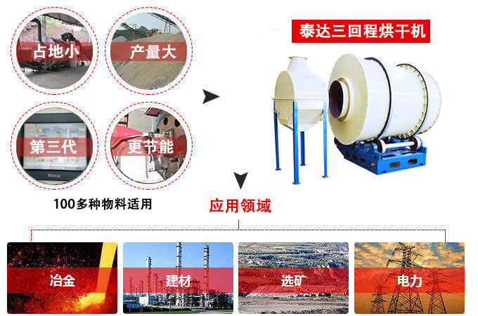 物料在烘干機內(nèi)走動三個回程,水分蒸發(fā)徹底,烘干成品均勻且質(zhì)量高,因為三回程結(jié)構(gòu),因此占地面積是長滾筒烘干機的1/3