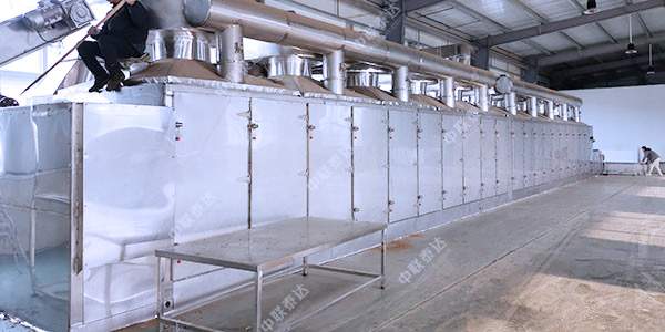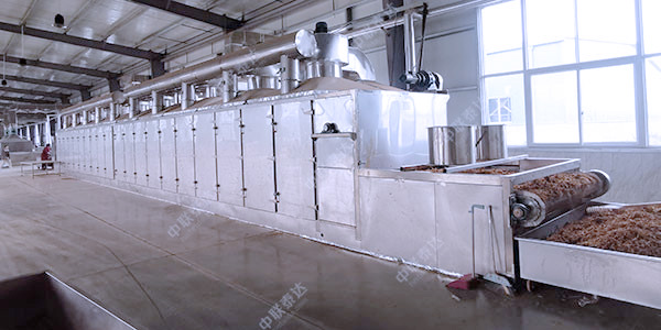網(wǎng)帶烘干機(jī)將所要處理的物料通過布料機(jī)構(gòu)分布在上層網(wǎng)帶上,輸送網(wǎng)帶一般采用12-60目的鋼絲網(wǎng)帶,輸送帶通過一個(gè)或幾個(gè)加熱單元組成的通道,由傳動(dòng)裝置拖動(dòng)在干燥機(jī)內(nèi)往返移動(dòng),每個(gè)加熱單元均配有空氣加熱和循環(huán)系統(tǒng),每一個(gè)通道有一個(gè)或幾個(gè)排濕系統(tǒng),在輸送帶通過時(shí),熱風(fēng)在物料間穿流而過,水蒸氣從排濕孔中排出,從而達(dá)到均勻干燥的目的。箱體長度由標(biāo)準(zhǔn)段組合而成,為了節(jié)約場(chǎng)地,可將烘干機(jī)制成多層式,常見的有二室三層、二室五層、長度6-40m,有效寬度0.6-3.0m。烘干前原料可以通過預(yù)烘干輸送機(jī)預(yù)烘干,烘干后的產(chǎn)品可以直接排出,也可以經(jīng)過冷卻輸送帶吹冷風(fēng)冷卻。